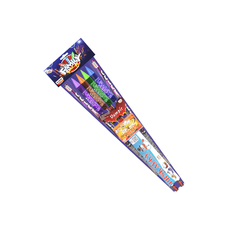 Rodinné balenie (malé) je vyvážená sada, ktorá ponúka mix jemnej, svetelnej a lietajúcej pyrotechniky ideálnej pre rodinné oslavy. Nájdeš v nej prskavky 16 cm (10 ks), štyri rakety Tomahawk, dve rímske sviece, jedného lietajúceho motýľa a balenie včeličiek (5 ks). Praktická sada, ktorá poteší deti aj dospelých bez zbytočných extrémov.
